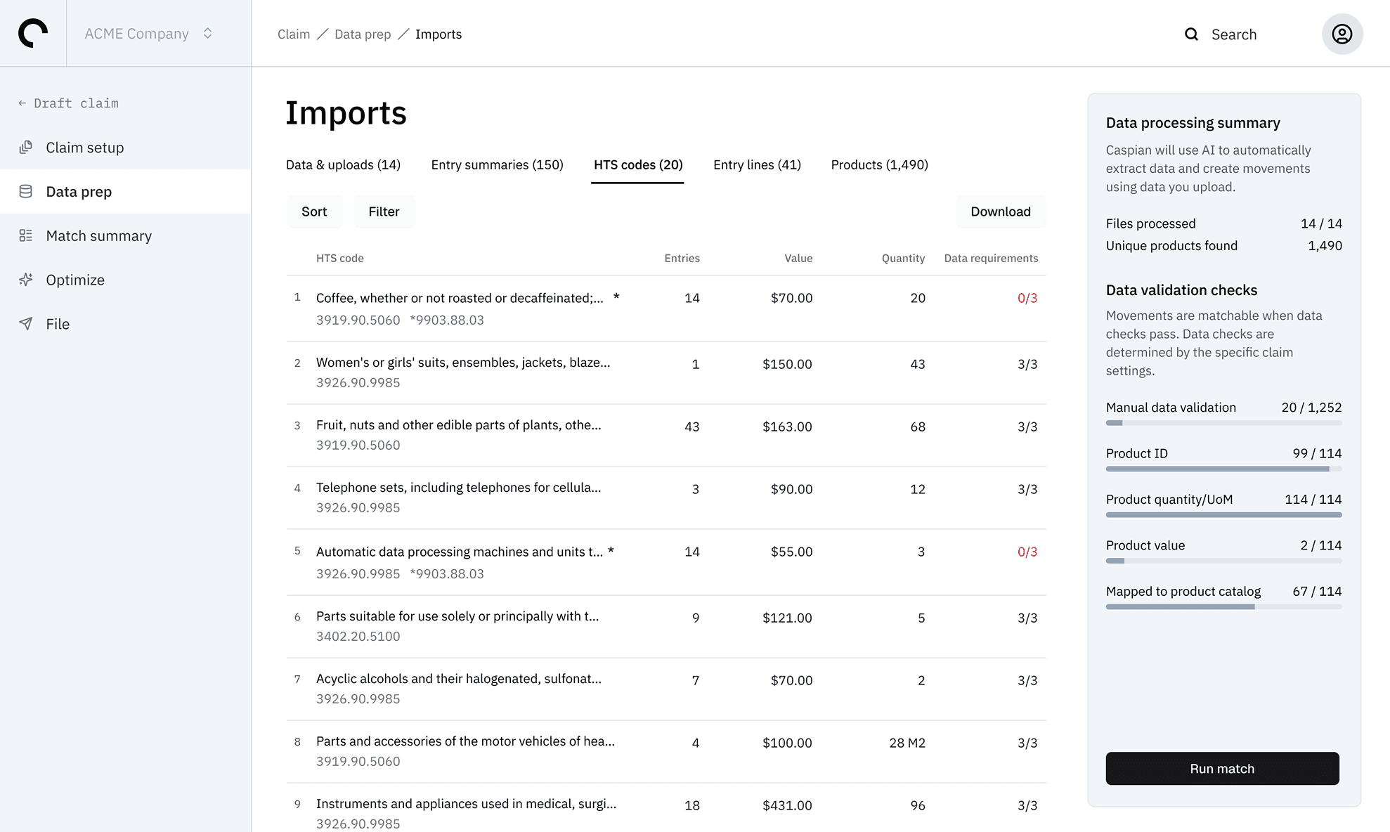 The platform reconciles millions of data points, instantly identifying all drawback opportunities per client and flagging compliance risks.